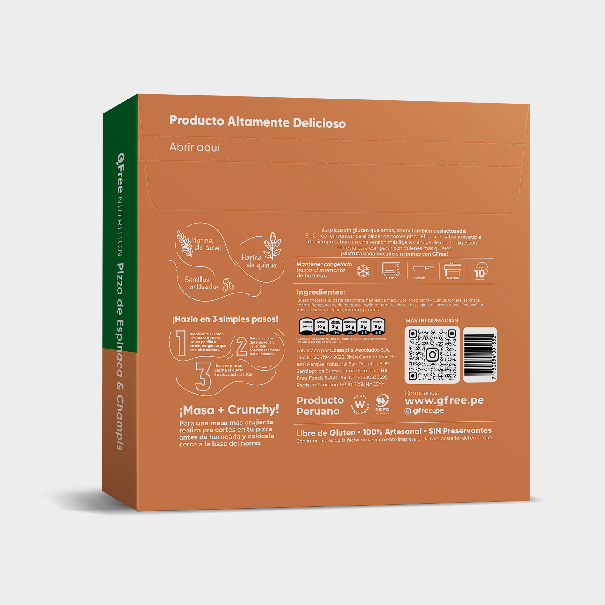 Pizza precocida sin gluten con queso mozzarella deslactosado, espinaca, champiñones y tomate.