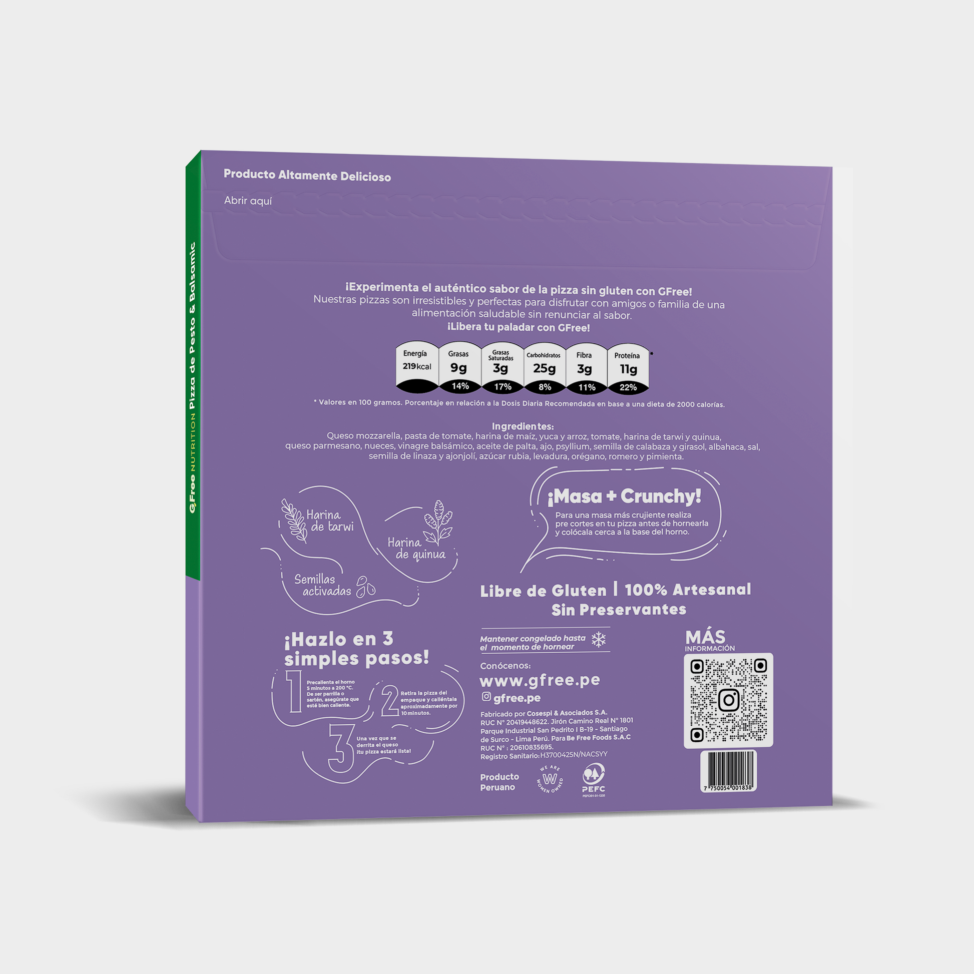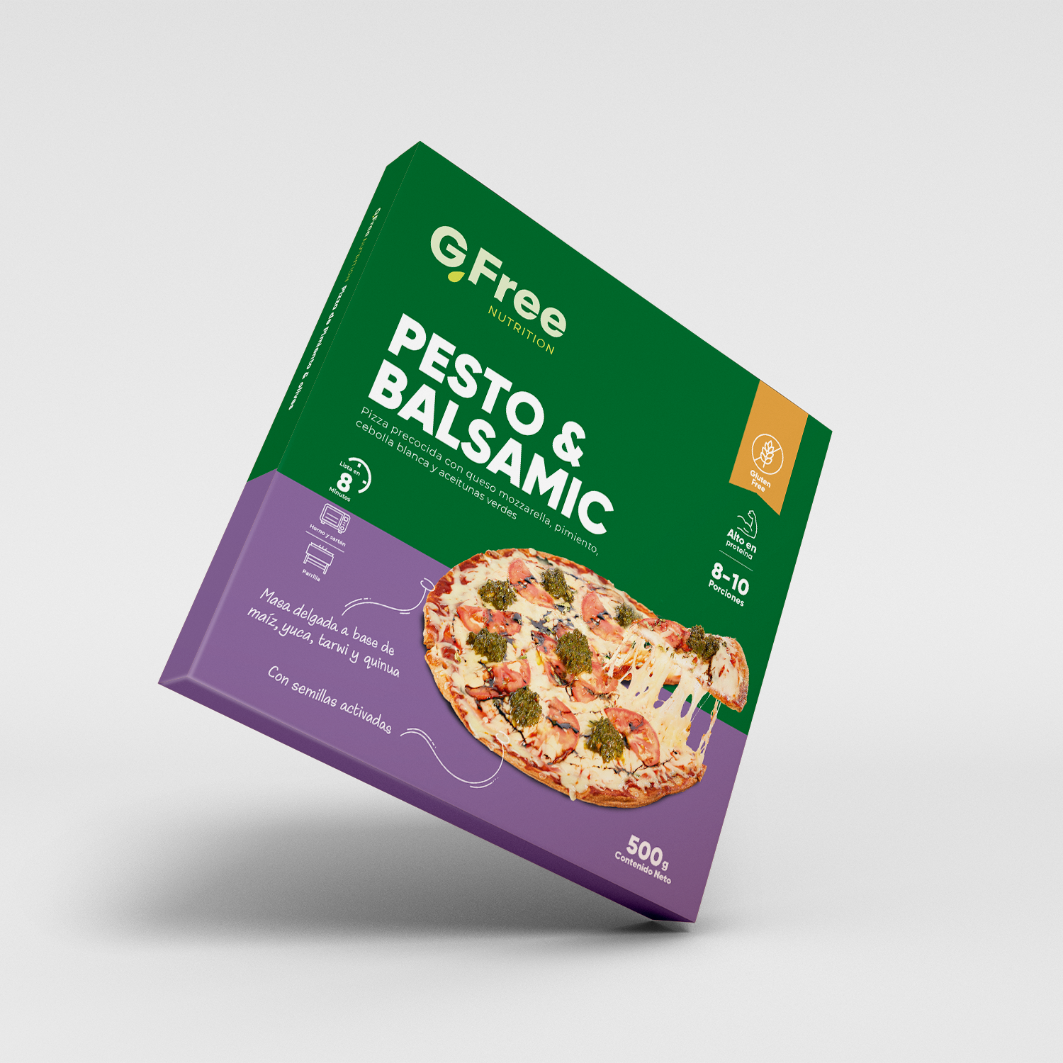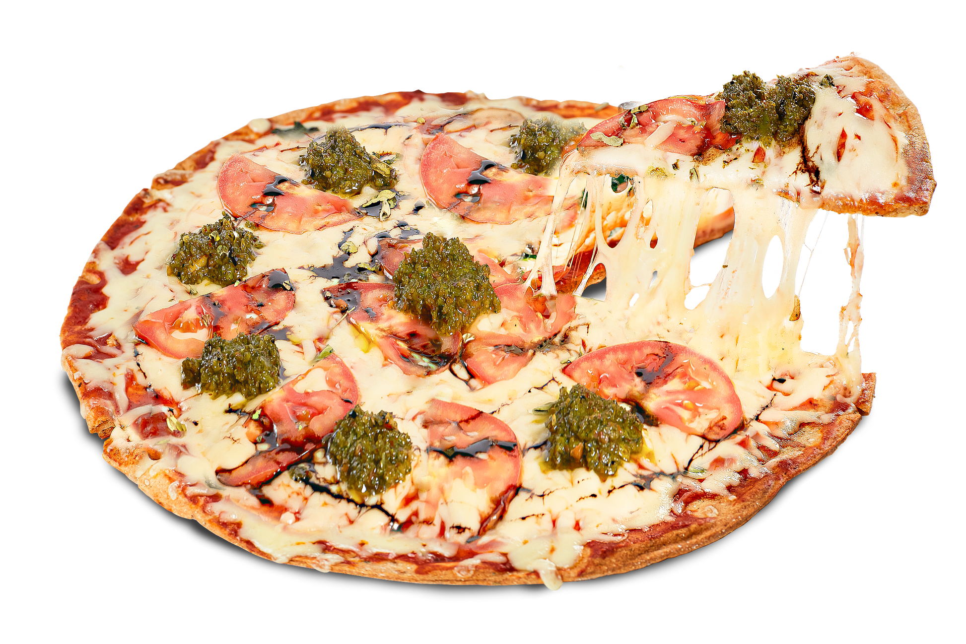 Pizza precocida con queso mozzarella, pesto, tomate y vinagre balsámico.