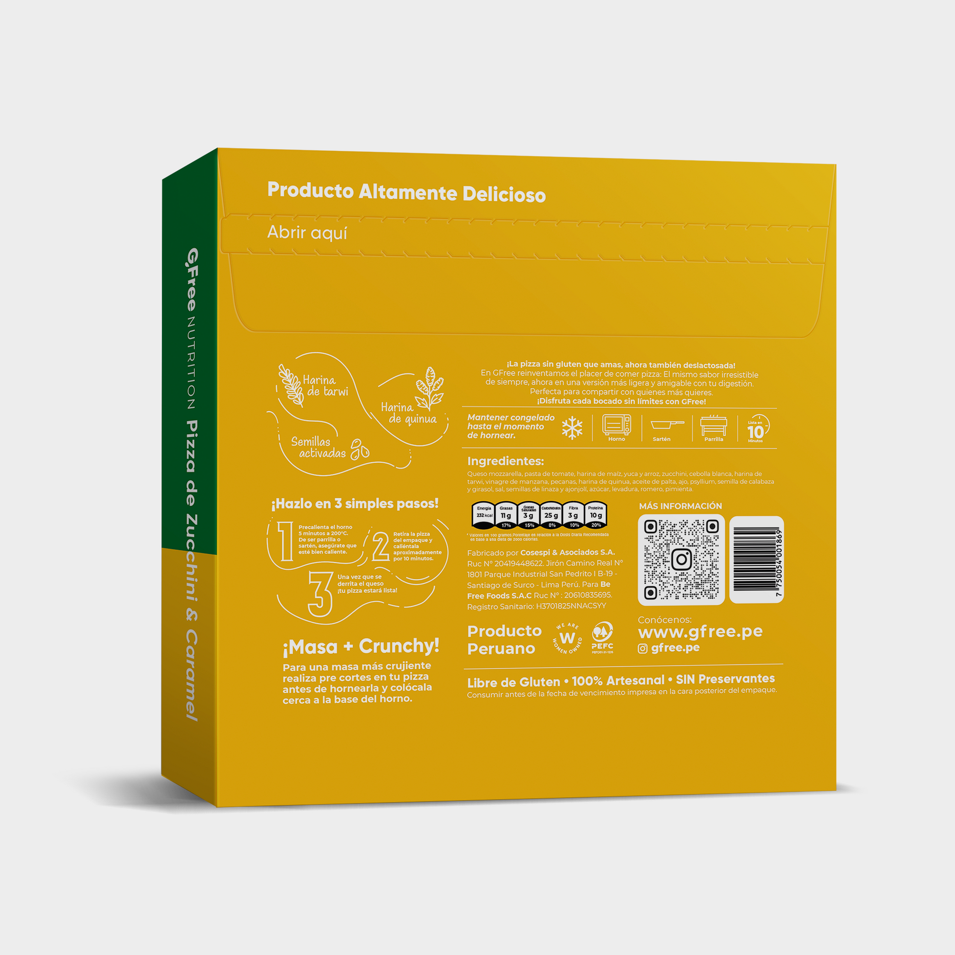 Pizza precocida sin gluten con queso mozzarella deslactosado, cebolla caramelizada, zucchini y pecanas.